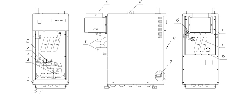 9. Глазок для розжига и контроля пламени 10. Сливная пробка 11. Транспортировочные проушины 12. Регулятор температуры 13. Дверка 14. Патрубок для присоединения к газопроводу 15. Решетка для регулировки подачи воздуха 16. Предохранительный клапан |